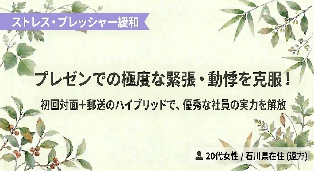 - 抱えていた課題: 昔から極度のあがり症。優秀で資料作りなどは完璧だが、プレゼンになると緊張から激しい動悸が起こり、言葉に詰まってしまう。